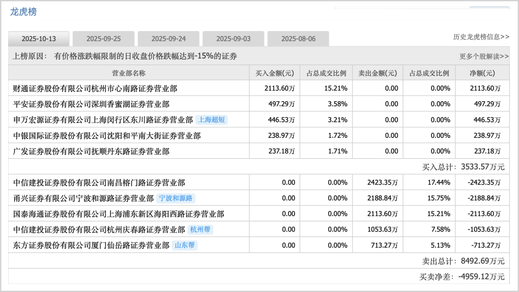 10月13日,上纬新材开盘一字跌停,封单超10万手,后一个交易日继续大跌15%(此后进入调整状态)。