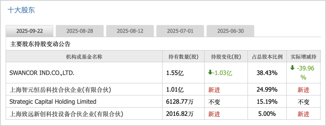 两个月后的9月23日,该笔交易顺利完成,上海智元恒岳和上海致远新创科技设备合伙企业合计拿到29.99%的股份,而原控股股东SWANCOR萨摩亚直接放弃表决权,将控制权拱手奉上。