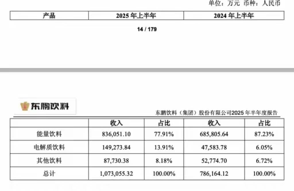 对比2024年上半年及2025年上半年财务数据,可以看出,东鹏饮料有意在提升其他品类的占比。