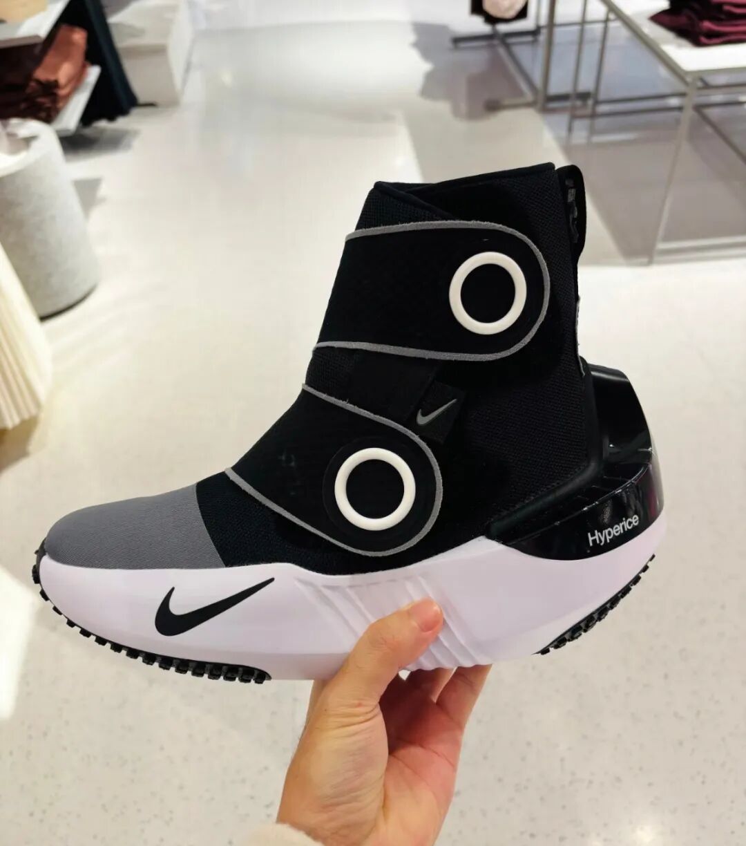 除了最近发售的Mind系列,耐克早在2025年年中,就发布了理疗鞋:Hyperboot,智能温控、隐藏式供电、蓝牙互联等特性,让这款售价近万元的鞋,显得未来感十足,简直像是科技产品。