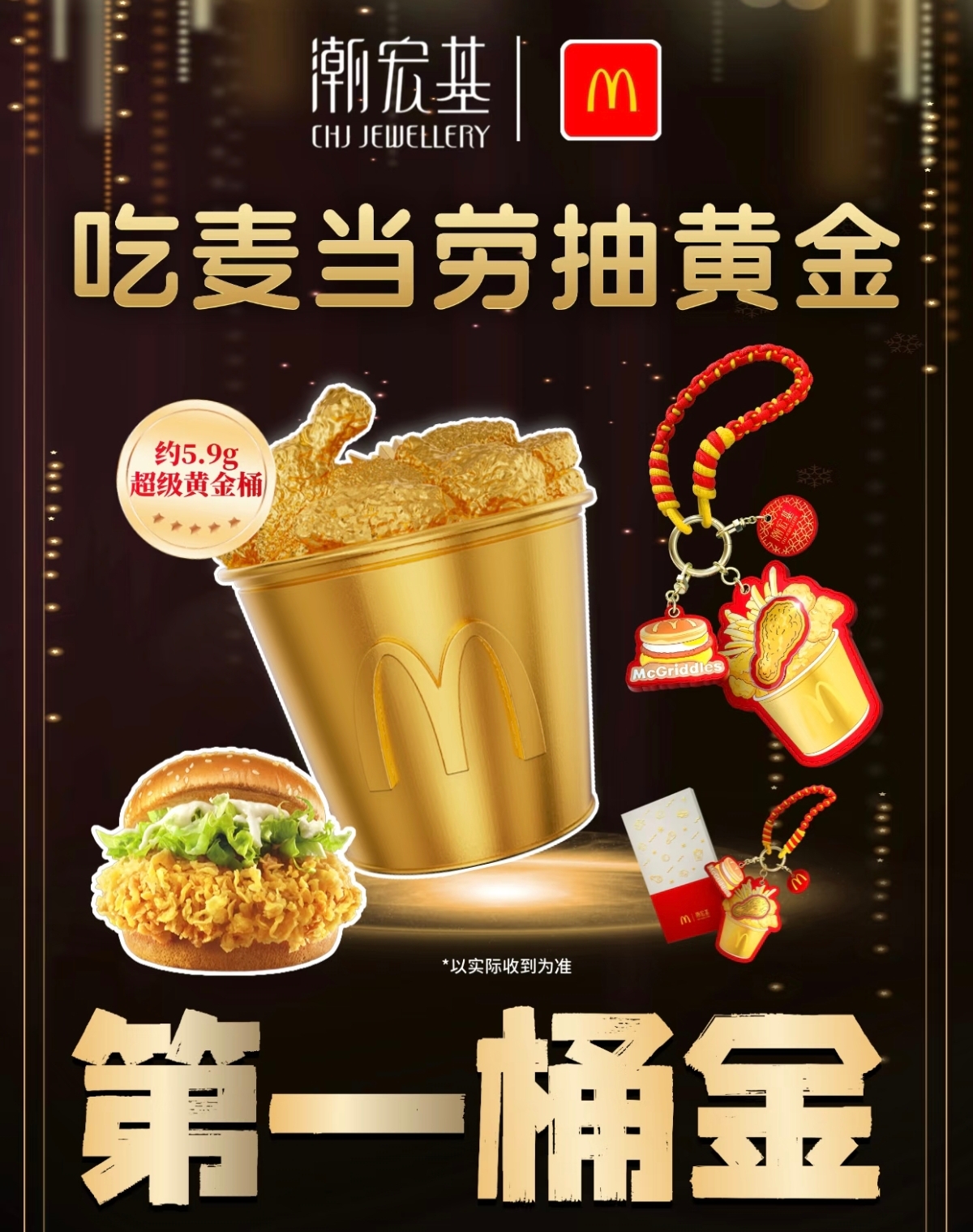 比如,麦当劳与潮宏基联名,推出了新年的第一桶金,消费者在指定门店购买活动套餐,就有机会参与抽奖,其中最高奖为5.9克的黄金全家桶,目前价值接近1万元。