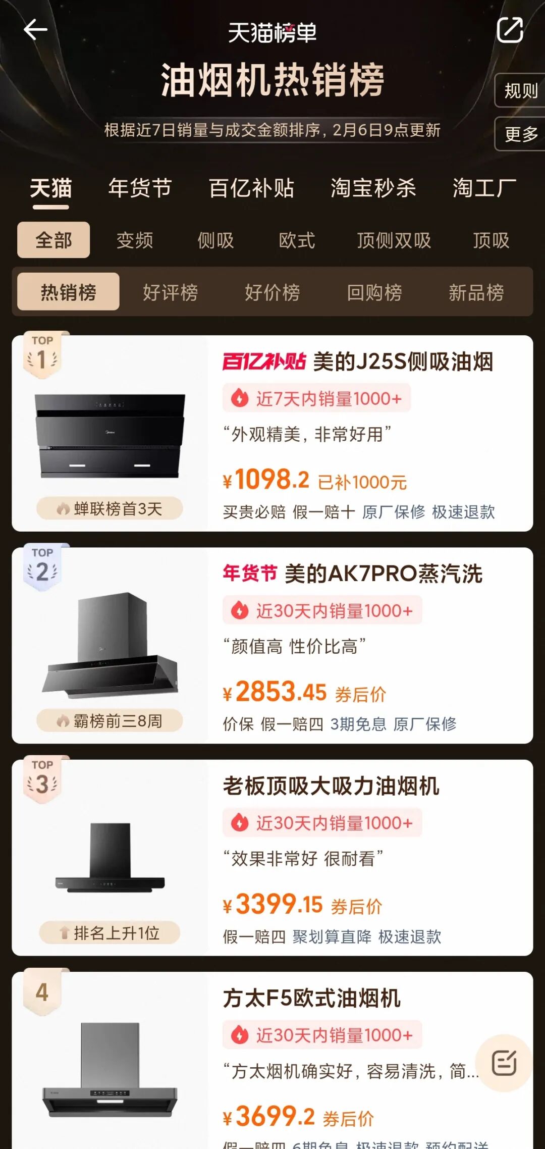 天猫油烟机热销榜上,前三名产品分别是美的J25S、美的AK7PRO、老板E2,方太的F5欧式油烟机,只能屈居第四。