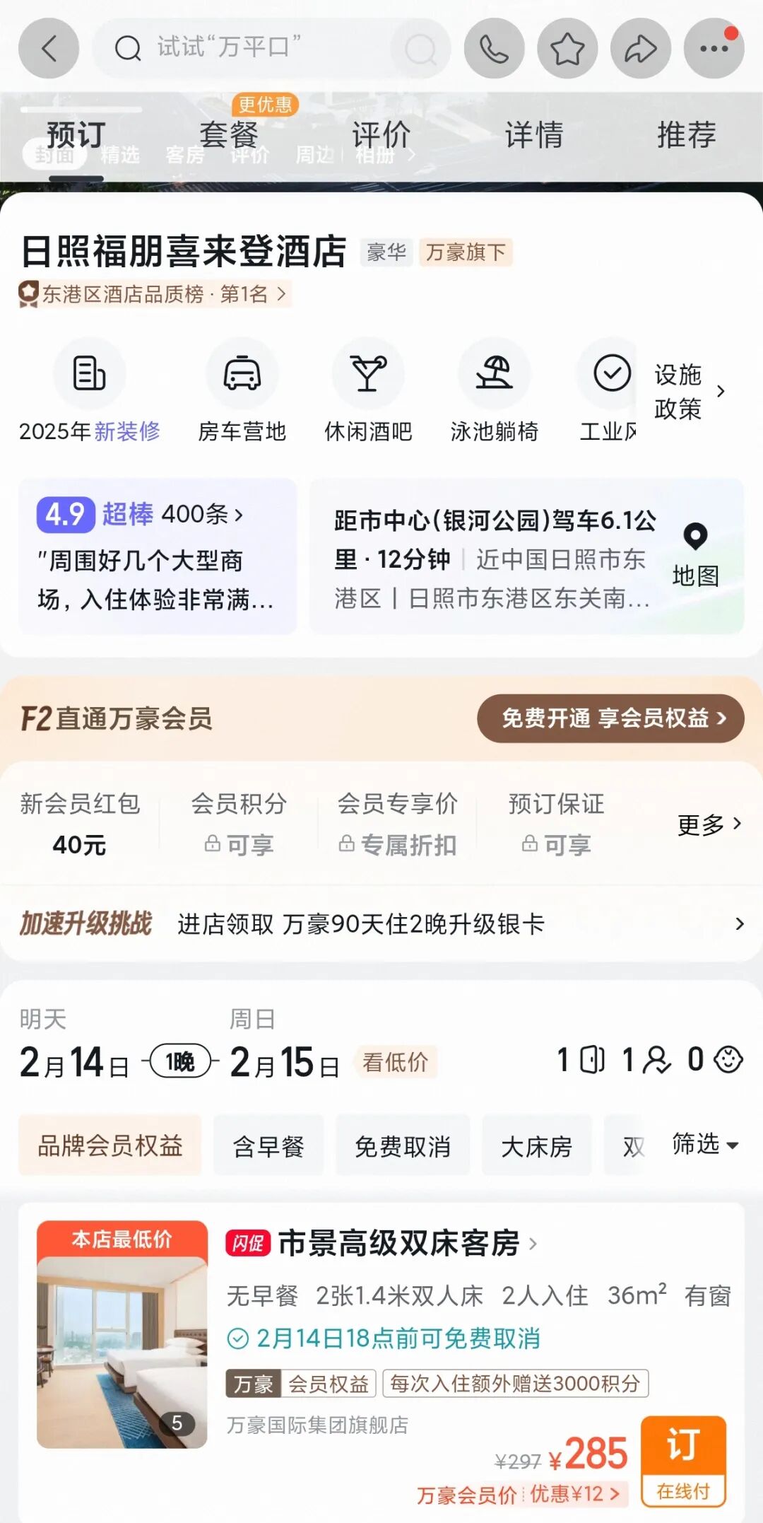 如果你是万豪白金会员,在飞猪花费285元预订该酒店,最终可以获得约6500积分;按二手市场10000积分500元计算,等于一次入住挣了325元,扣除房费还净赚了40元。