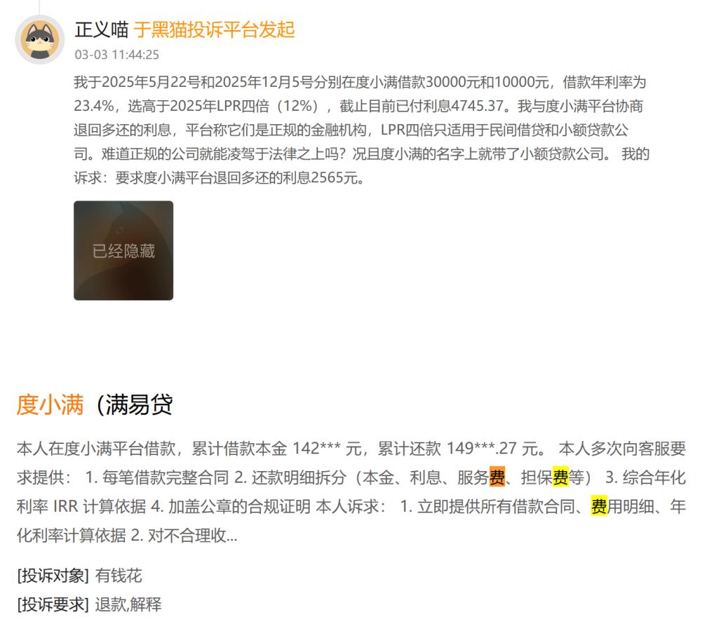 多位用户反映,度小满的利率在23.4%之间,紧贴24%的司法保护上限,部分超出当前1年期LPR的4倍。还有用户投诉,有钱花在4200元到账后就被扣走服务费,质疑是否属于“砍头息”?