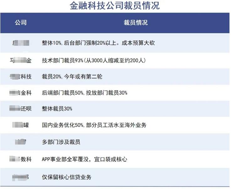 不久前,有一张金融科技企业裁员的表格流出,说是数某科技裁员约30%,马某消费技术团队从3000余人缩减至约200人,度某某裁员约10%且有部分业务线暂停借款服务。