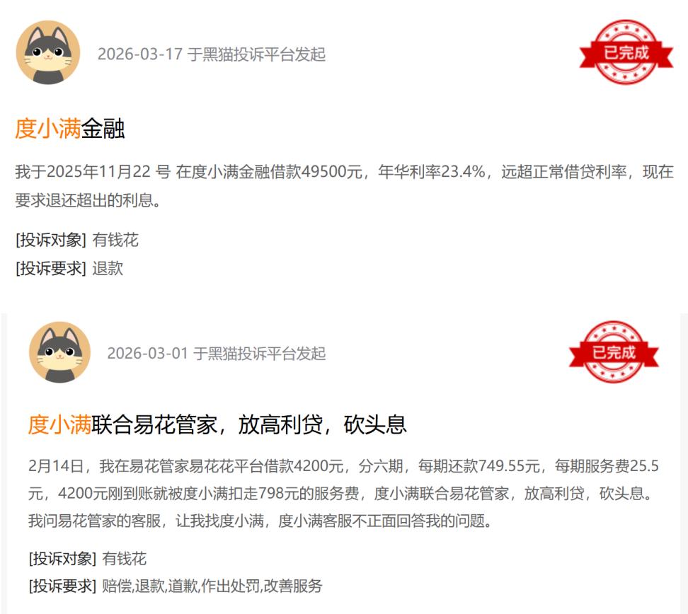 以仍然能大手笔冠名S级综艺的度小满为例,黑猫投诉平台数据显示,度小满及旗下“有钱花”相关投诉量累计超9万条,利率过高、被恐吓催收、被收取部分服务费、担保费等不合理费用,成为了投诉高发区。