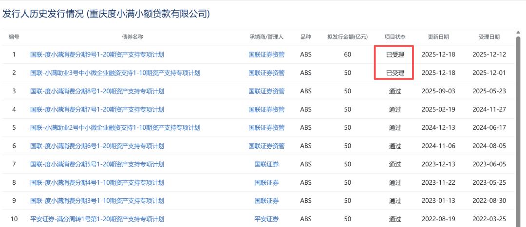 另一方面,度小满为了拓宽资金来源,也相当拼。从去年开始,其发行ABS(资产支持证券)的速度明显加快,2025年6月和9月,度小满各有一笔ABS获批。