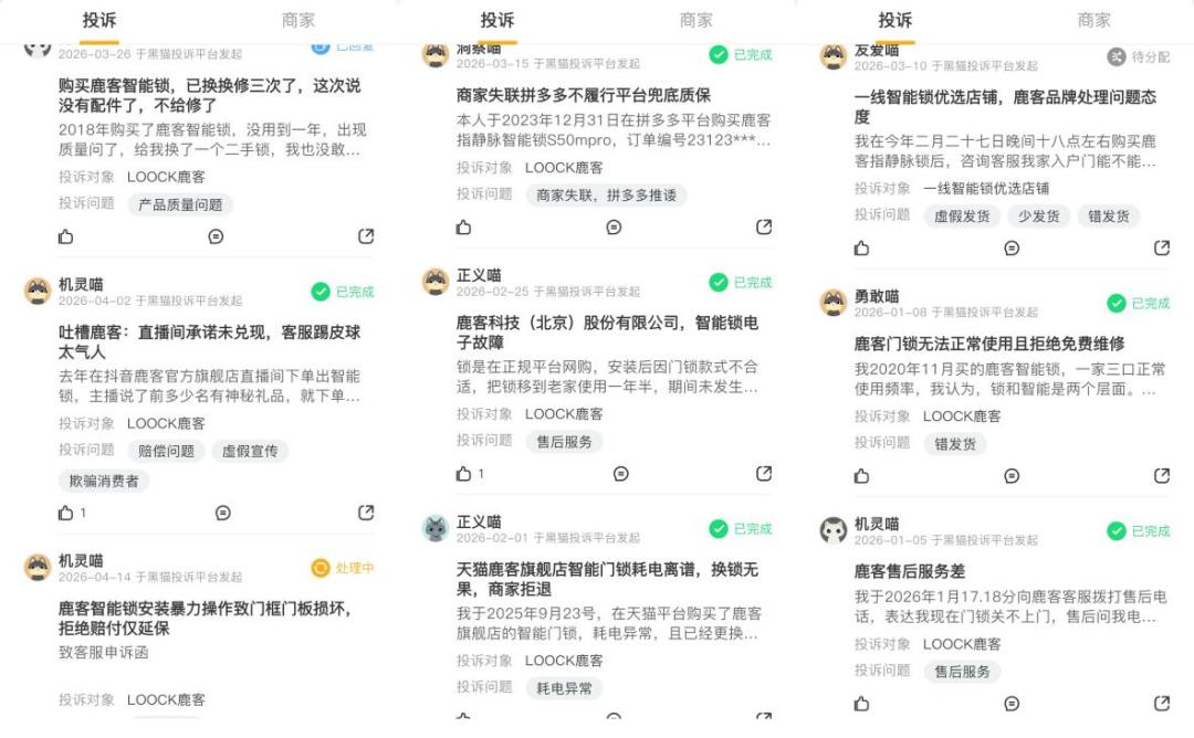 黑猫投诉平台上,关于鹿客智能锁的投诉近1000件,消费者投诉集中于电池故障、指纹识别失效、售后服务不到位、“过保就坏”等。有消费者反映安装仅三天即出现故障,售后检测后以“已过保修期”为由要求付费维修。另有消费者在保修期内遭遇售后推诿,官方售后以“非官方店铺购买”为由拒绝保修。